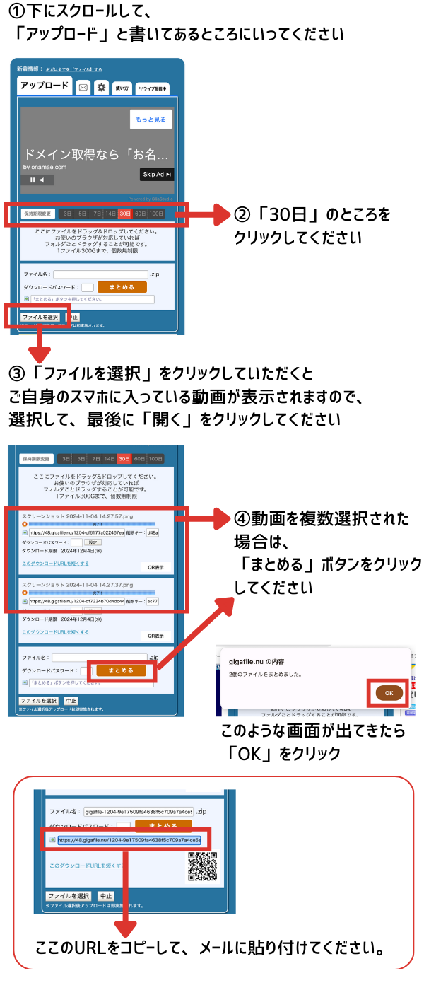 動画を送る方法:ギガファイル便などのファイル転送サービスでお願いいたします